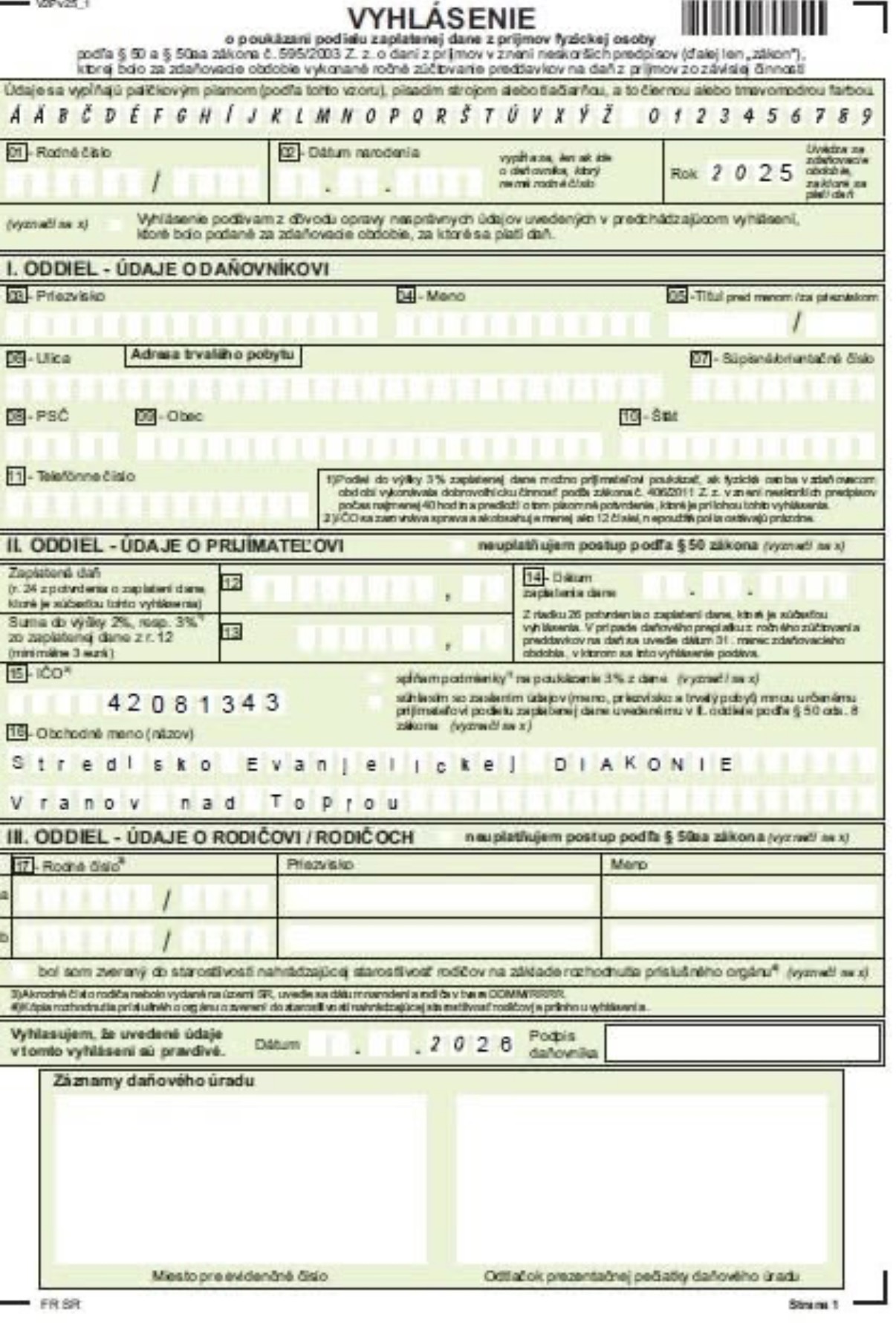 Súčasne môžete poukázať 2% z dane aj mame aj otcovi. Spolu je tak možné poukázať až 6% zo svojej dane.